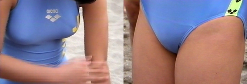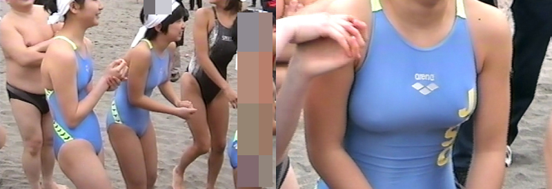 どこかのか寒中水泳大会のようです寒そうなのが伝わります。一時間にわたり、ここではまだ未使用?の可憐な突起を布越しに堪能できます、パッドがあると水の抵抗を邪魔するのですかね、、、。見ているこちらが恥ずかしい。